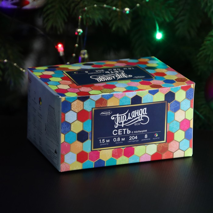 Гирлянда «Сеть» d=1.5 м с кольцом на ёлку, IP20, тёмная нить, 204 LED, свечение мульти, 8 режимов, 220 В