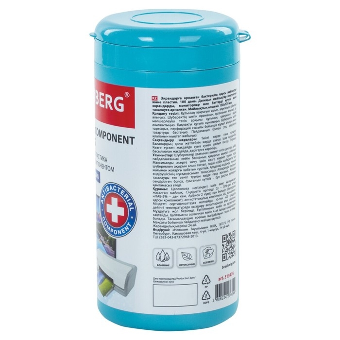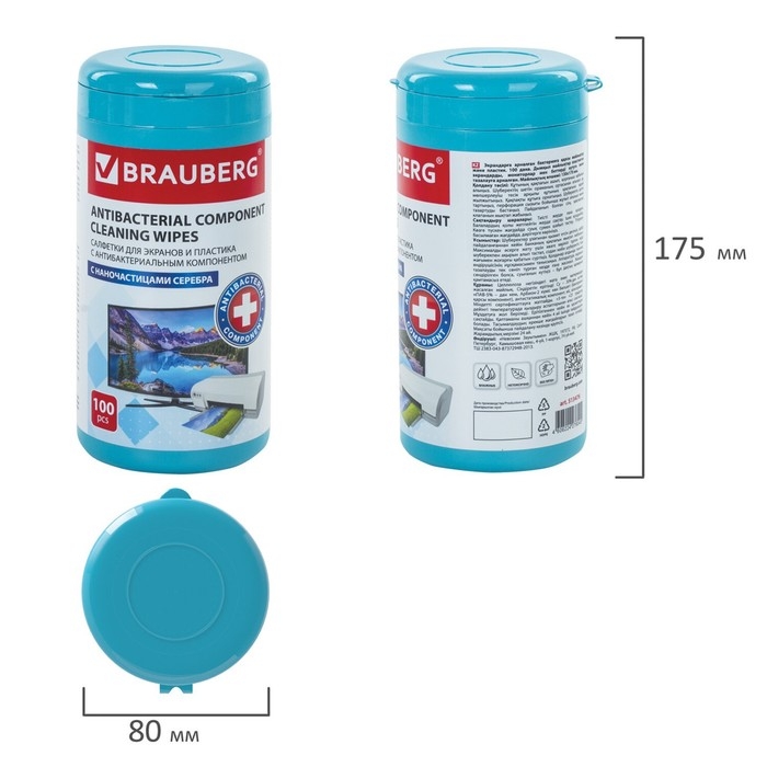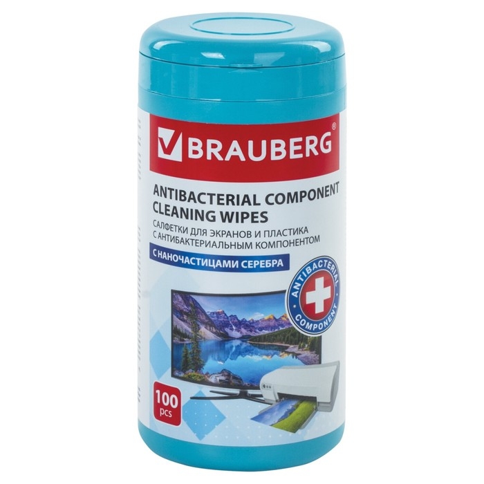 Салфетки чистящие д/экранов всех типов BRAUBERG, 13x17 см, 100 шт в тубе, пл, влажн, антиб
