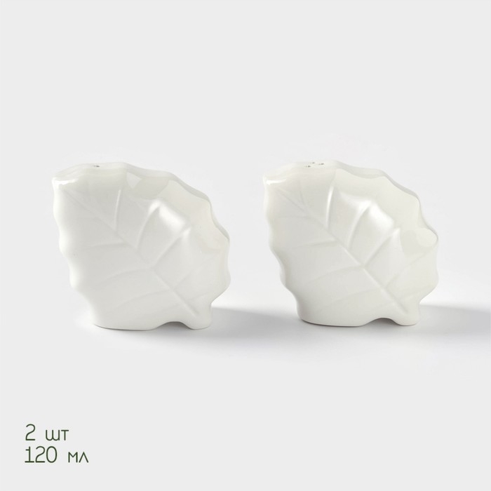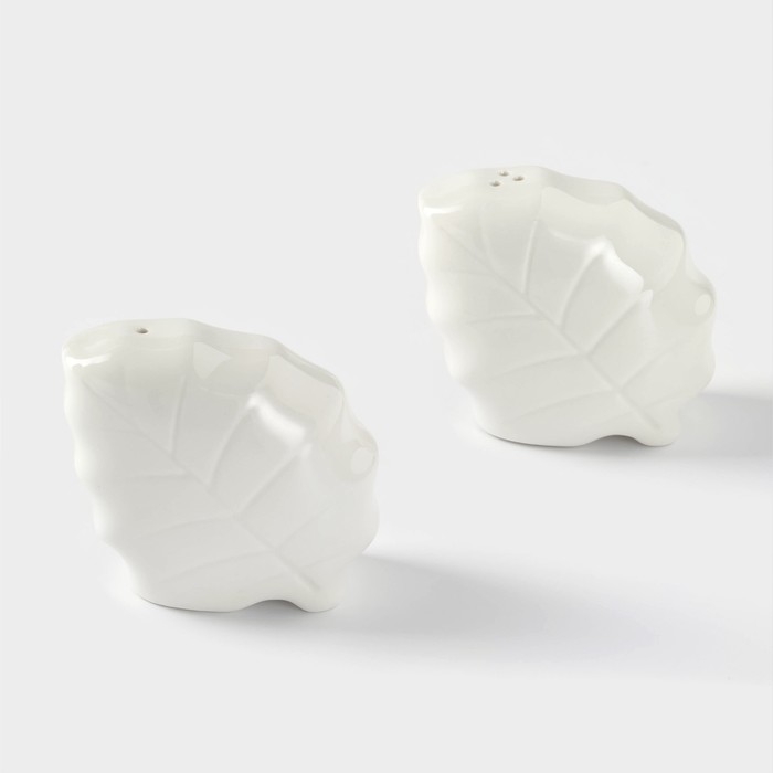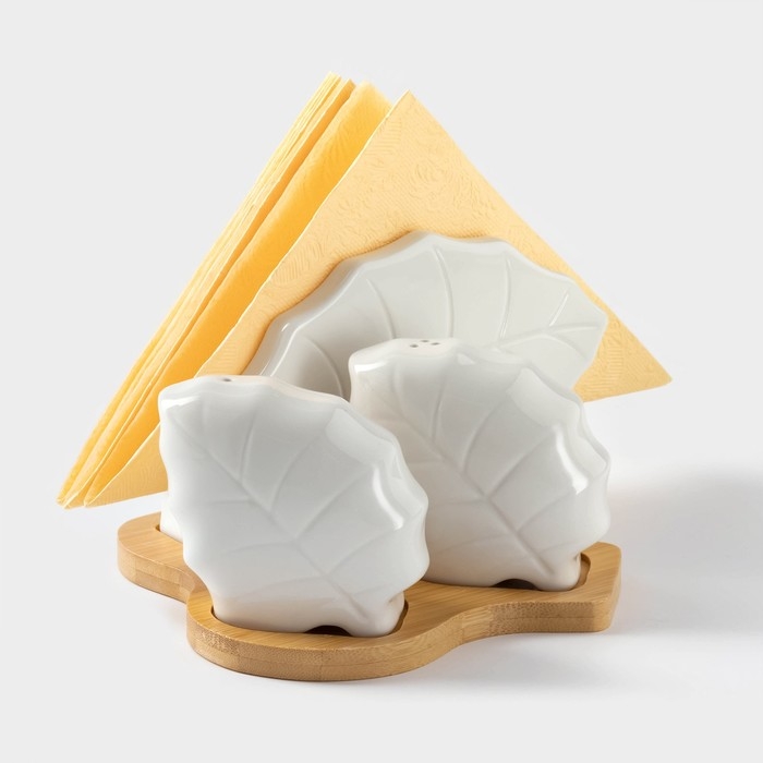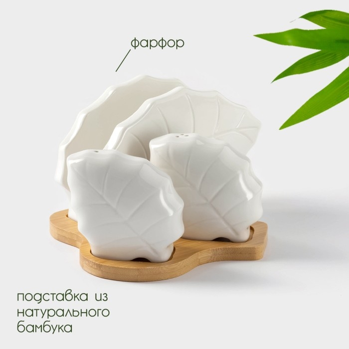 Набор фарфоровый для специй на бамбуковой подставке BellaTenero «Листья», 4 предмета: солонка 120 мл, перечница 120 мл, салфетница, подставка, цвет белый