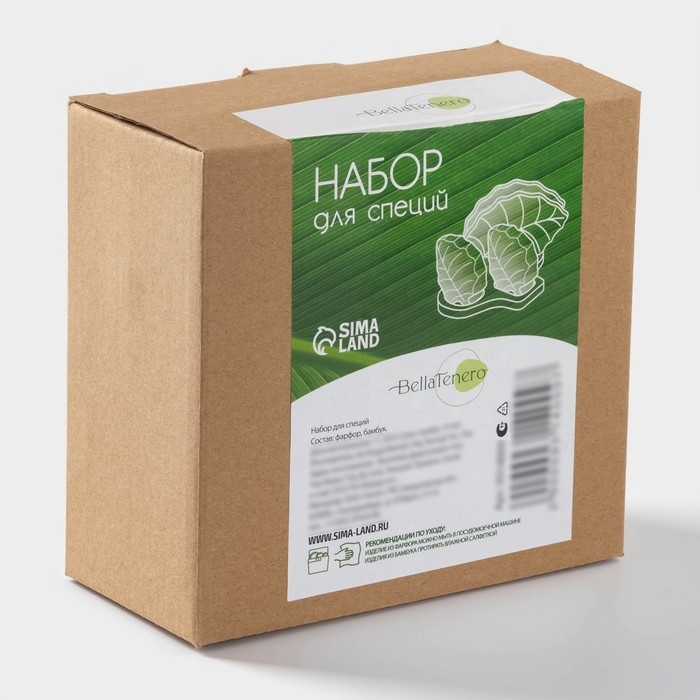 Набор для специй BellaTenero «Листья» изготовлен из качественного фарфора. Кухонные изделия из фарфора отличаются прочностью и надёжностью, устойчивы к появлению царапин и резким перепадам температур. Благодаря оригинальному дизайну и причудливым формам набор отлично впишется в интерьер вашей кухни и станет настоящей изюминкой при сервировке.