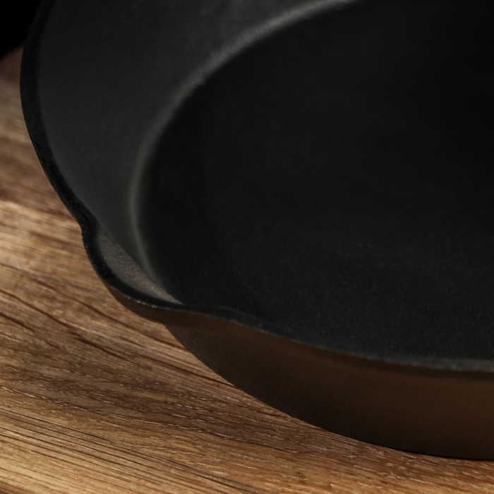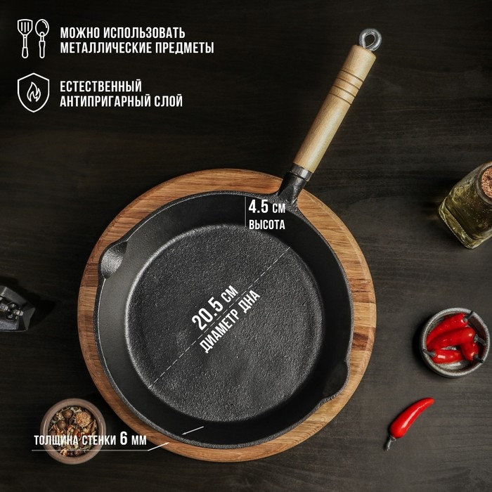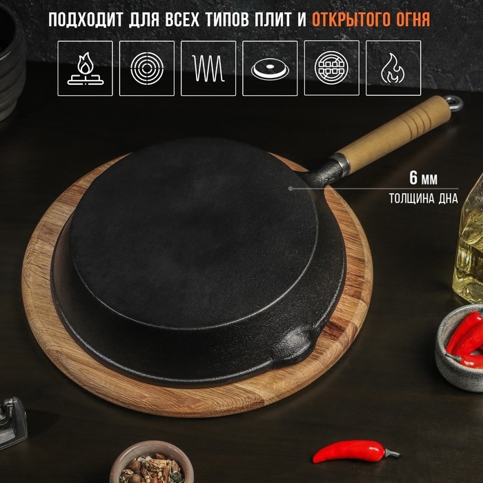 Сковорода чугунная Magma «Эко», 25×4,5 см, с 2 сливами и съёмной деревянной ручкой, индукция, цвет чёрный