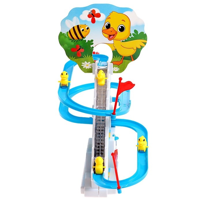 - Утята сами поднимаются по эскалатору и скатываются с горки.