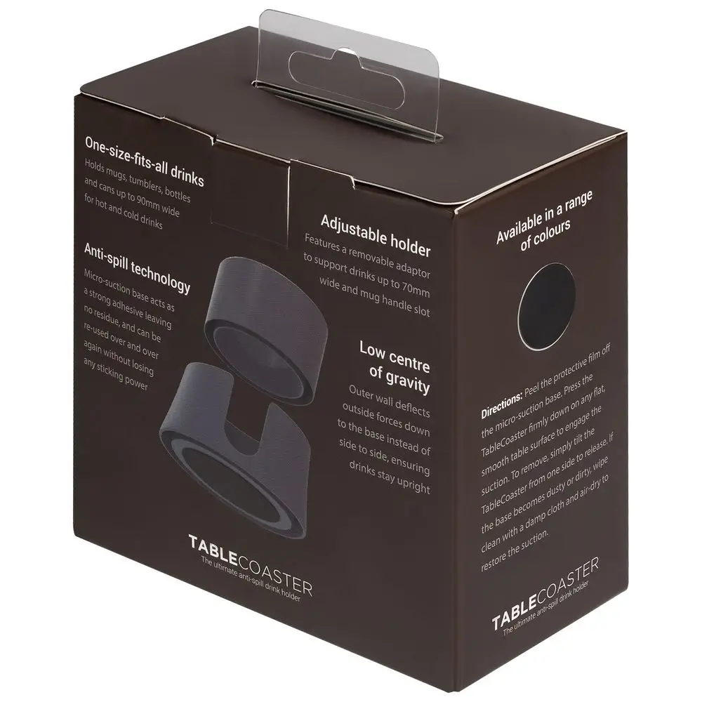 Подставку можно расположить на рабочем столе, прикроватной тумбочке или в машине — в любом месте Tabletop не даст чашке разбиться, а ее содержимому пролиться. Липкое основание конструкции представляет из себя поверхность из множества микроскопических присосок, поэтому уронить и даже сдвинуть подставку с места очень непросто — любимая чашка и клавиатура будут под надежной защитой. Благодаря внутренней вставке подходит для емкостей разного диаметра.