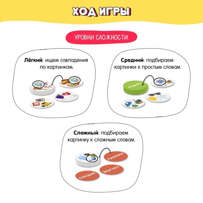 - Задача каждого игрока — находить на столе жетоны с картинками, названия которых написаны на его верхнем жетоне. Забирая жетон в стопку с помощью липучки, игрок кладёт его так, чтобы видеть написанное на нём слово и подбирать к нему новый жетон.