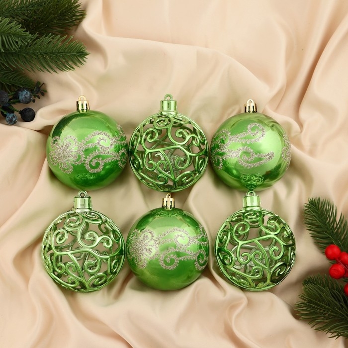 Набор шаров пластик d-8 см, 6 шт "Эстер" узор, зелёный