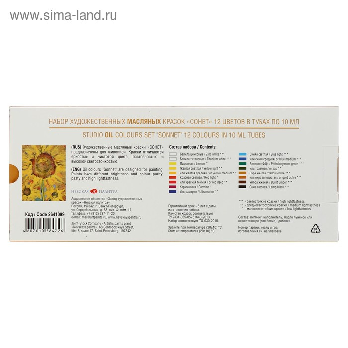Краска масляная художественная, набор 12 цветов х 10 мл, ЗХК "Сонет", 2641099
