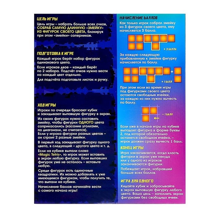 Настольный вариант классической игры. Попробуйте собрать самую длинную змейку в настольной игре «Магия тетриса». Помните: соперникам можно и нужно мешать! Но не расслабляйтесь, ведь вам тоже придётся справляться с кознями противников!