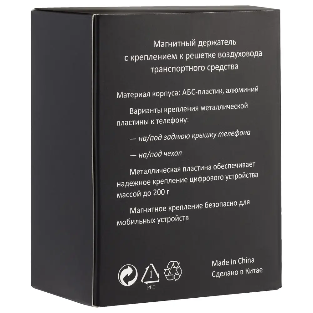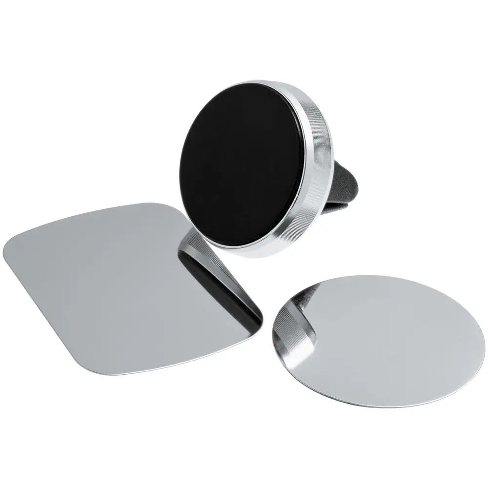 Магнитный держатель для смартфонов с креплением в воздуховод. В комплекте две металлические пластины, которые можно приклеить с помощью двухстороннего скотча (в комплекте) или вложить под заднюю крышку или чехол, чтобы не портить внешний вид телефона.Выдерживает устройство массой до 200 г.