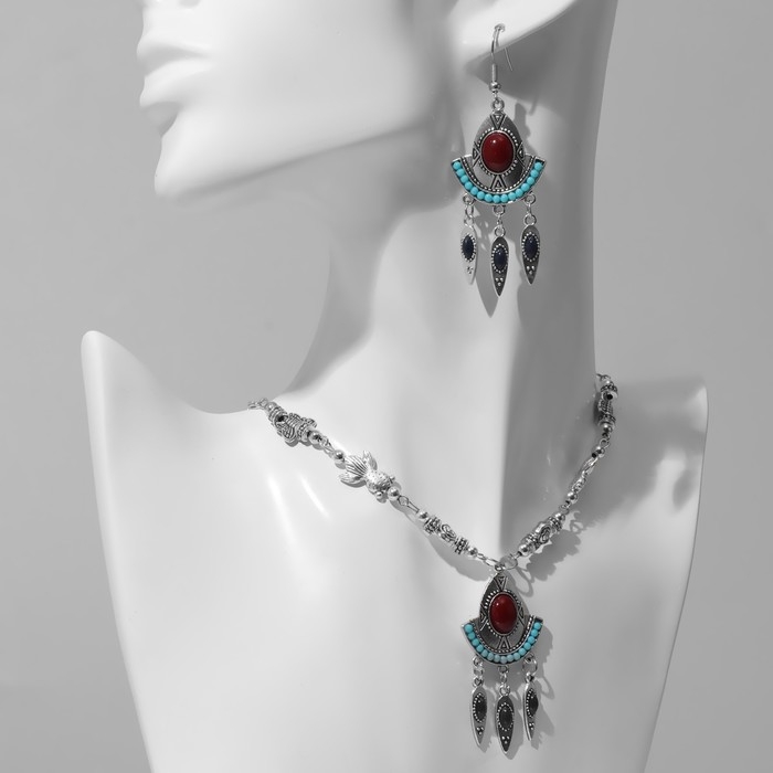 Набор 2 предмета: серьги, колье «Индия», цвет красный в чернёном серебре, 52 см