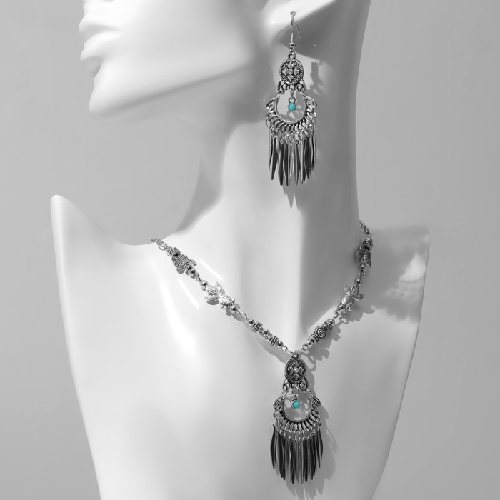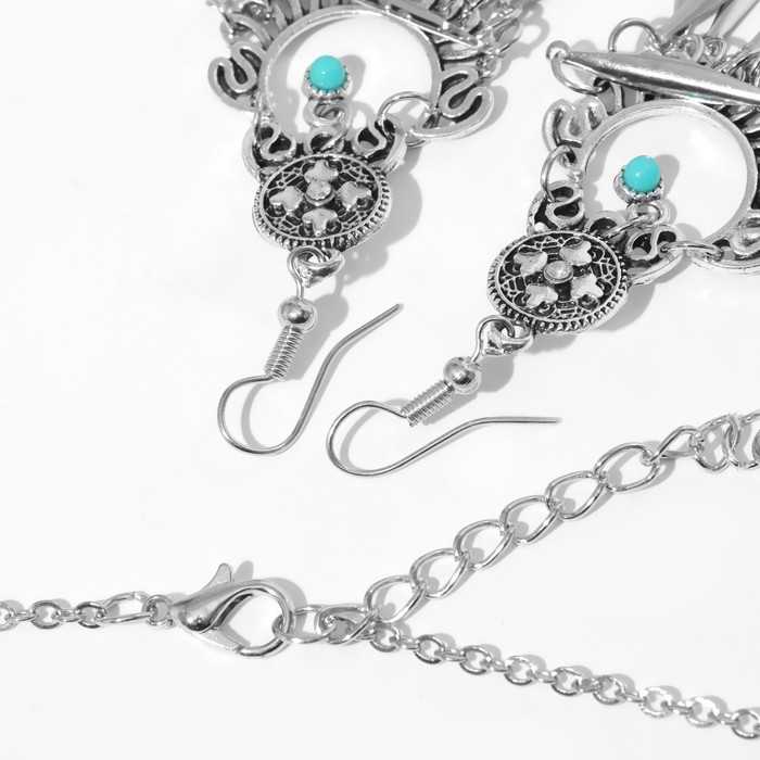 Набор 2 предмета: серьги, колье «Индия» флора и фауна, цвет голубой в чернёном серебре, 32 см