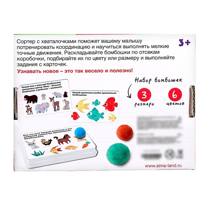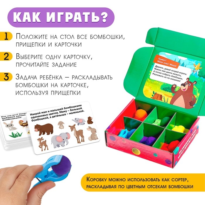 Внутри вы найдёте 18 цветных бомбошек разных размеров, 10 двусторонних карточек с 20 заданиями и 2 прищепки.