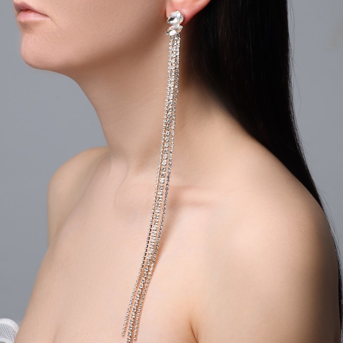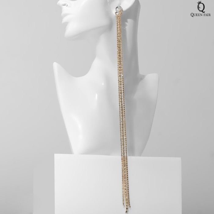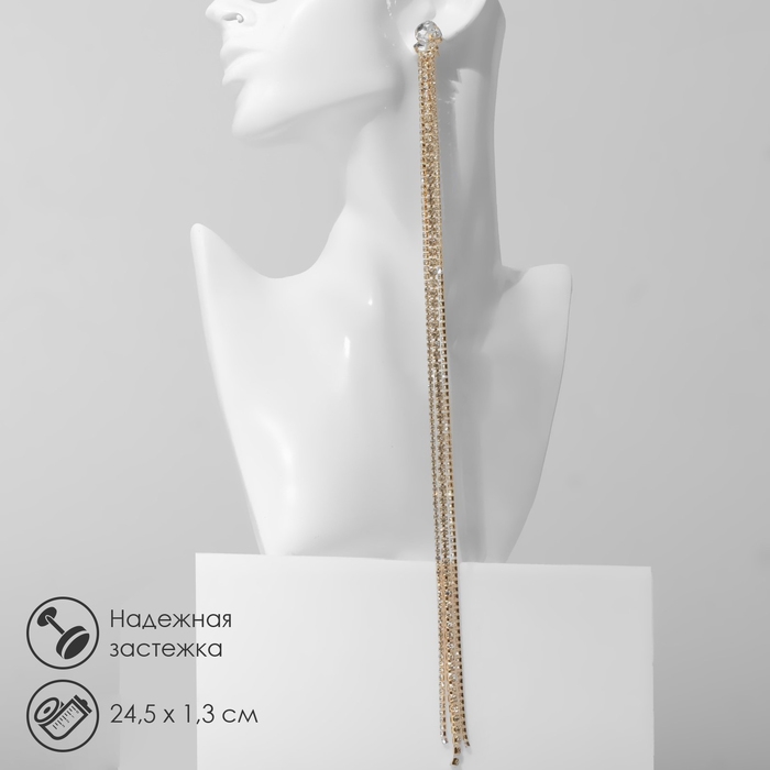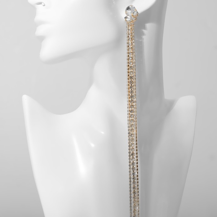 Серьги висячие со стразами «Водопад» овал 3 нити, цвет белый в золоте, 32 см