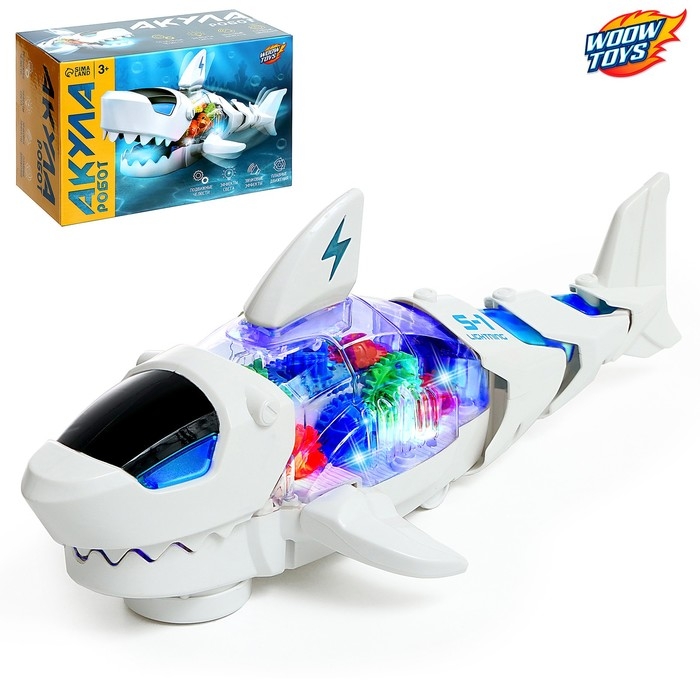 Акула «Шестерёнки» — игрушка с прозрачным корпусом. У неё внутри есть подсветка и движущиеся элементы! Акула объезжает встречающиеся препятствия и воспроизводит забавные звуки и мелодию.