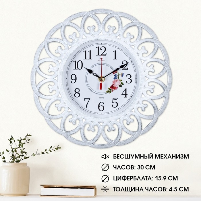Настенные часы диаметром 30 см. - отличное решение для тех, кто хочет сделать свой интерьер оригинальным и индивидуальным. Винтажный стиль, изысканный ажурный орнамент добавит шарма в любое помещение. Часы работают от одной батарейки АА "пальчиковая", в комплект не входит. Ход часов плавный, бесшумный. Кварцевый механизм гарантирует точность хода и долгосрочную эксплуатацию.