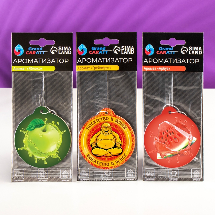 В шоу-бокс Grand Caratt входят три вида подвесных ароматизаторов, подходящих для автомобиля и дома. Имеют лёгкий вес и цепляются за подвес на лобовое стекло. Можно положить в любую нишу. Специальный картон пропитан парфюмерной композицией и источает приятный аромат, который охватит окружающее пространство и будет успокаивать и одновременно помогать оставаться бдительным. А яркий дизайн ароматизатора послужит хорошим украшением для салона.