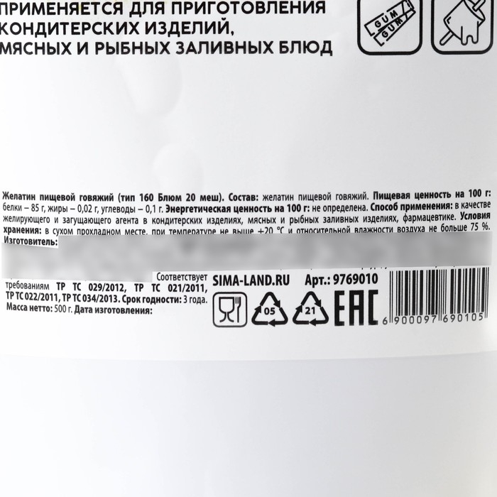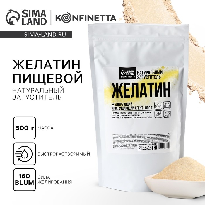 Желатин пищевой 160 Блюм, желирующий и загущающий агент для варенья, суфле и йогуртов, 500 г.