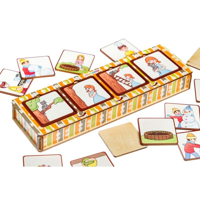 - Игра «Паровозик из картинок». Разложите на столе серию из четырех картинок. Предложите ребёнку внимательно рассмотреть их и разложить по порядку слева направо в «окошки», расположенные на крышке коробочки. Поиграйте таким же образом со всеми оставшимися картинками.