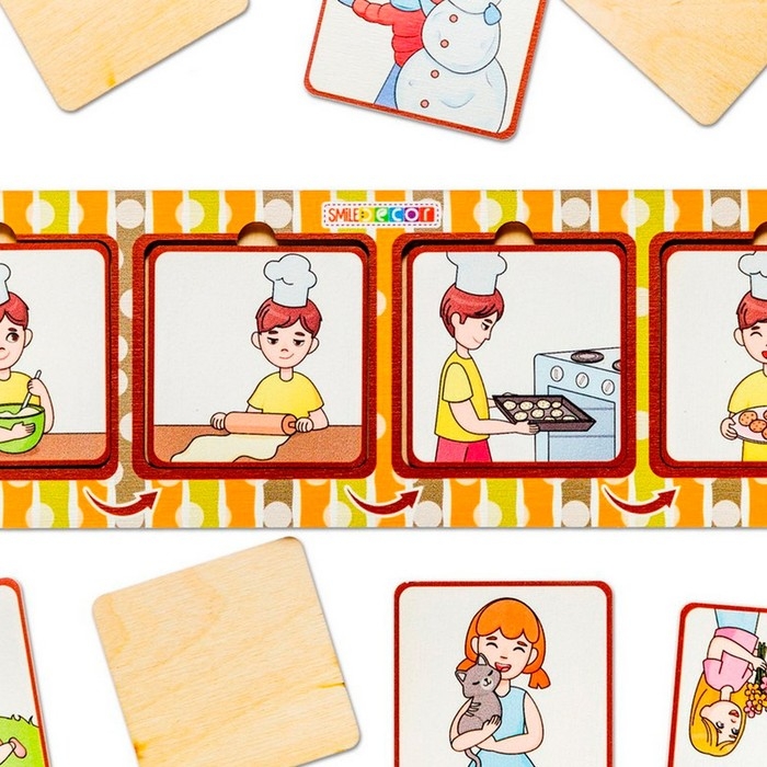 - Игра «Что не так?» Перед началом игры разложите картинки из одной серии в «окошки», заведомо допустив ошибки. Задача ребёнка – найти и исправить ваши неточности, объяснить, почему необходимо поменять картинки местами.