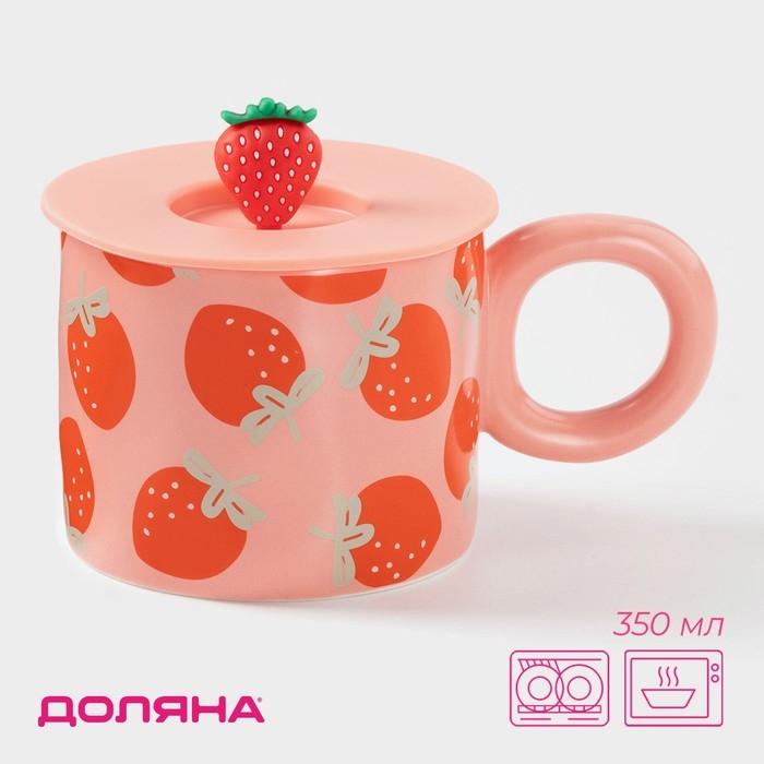 Кружка керамическая с силиконовой крышкой Доляна «Клубника», 350 мл, цвет красный