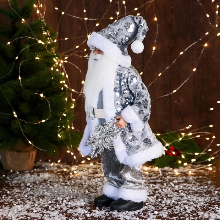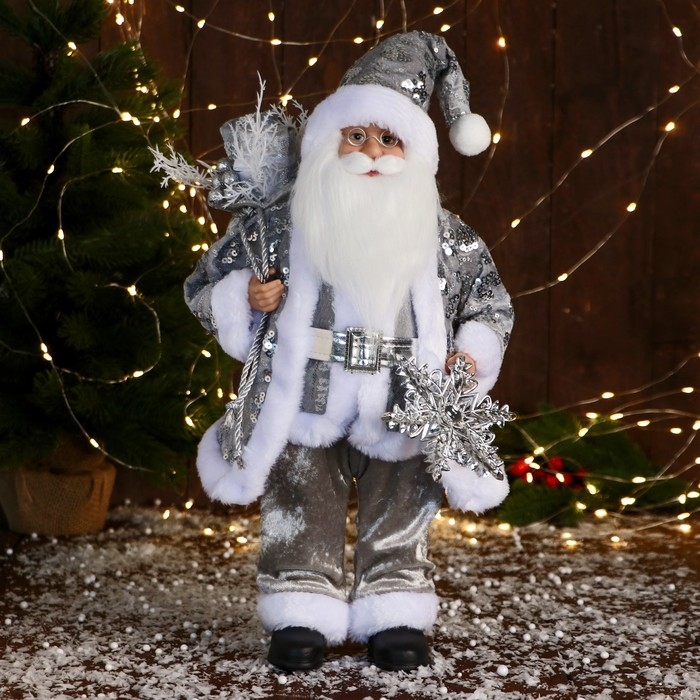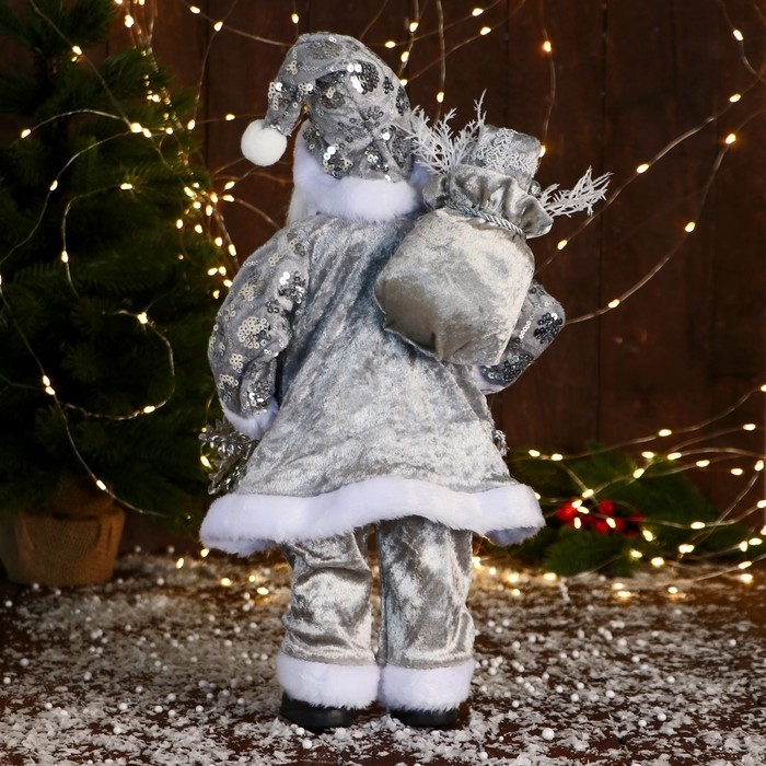 Дед Мороз "В костюме с пайетками и с подарками" 43 см, серебро