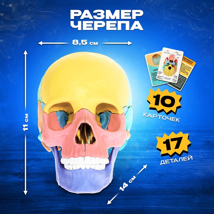 - В комплекте есть 10 двусторонних карточек, в которых написана информация о черепе и его строении.