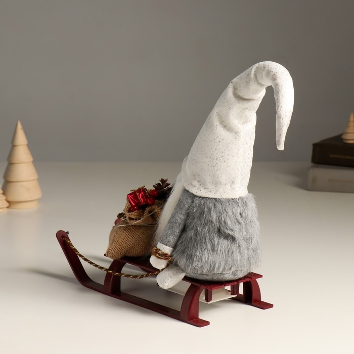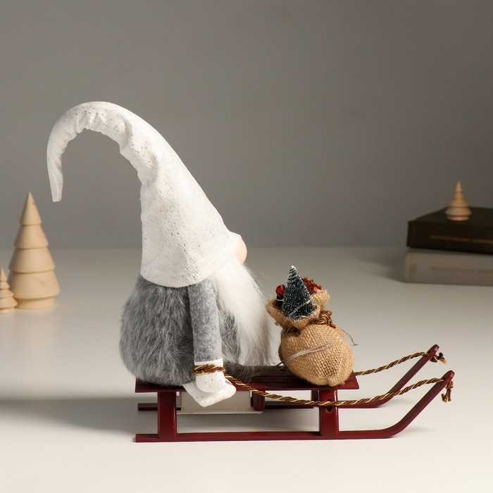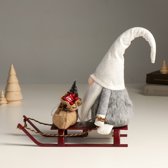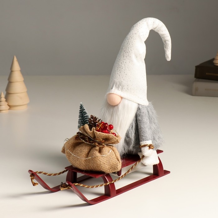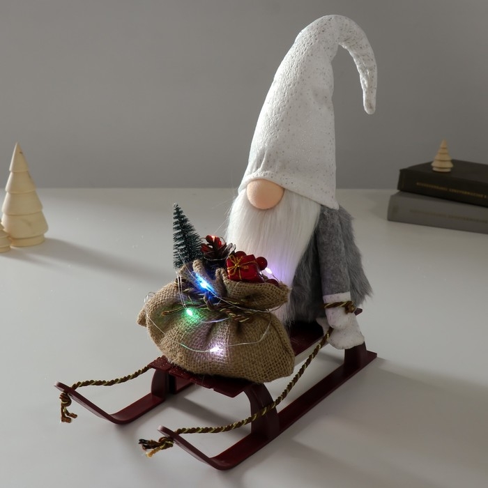 Кукла интерьерная свет "Гном в блестящем колпаке с мешком подарков на санках" 10х26х41 см