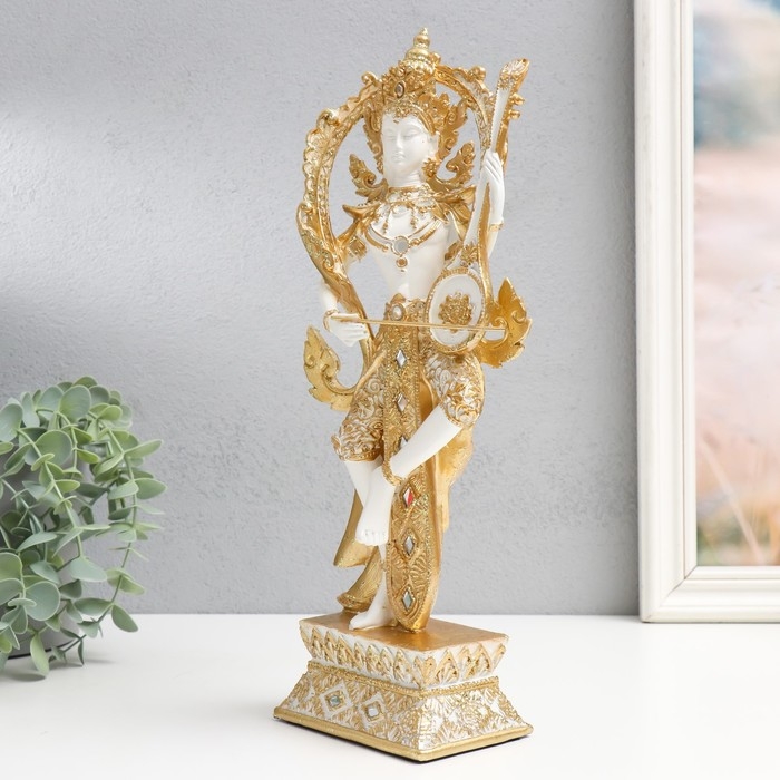 Сувенир полистоун "Танцующее божество с музыкальным инструментом" бело-золотой 13х9х34 см