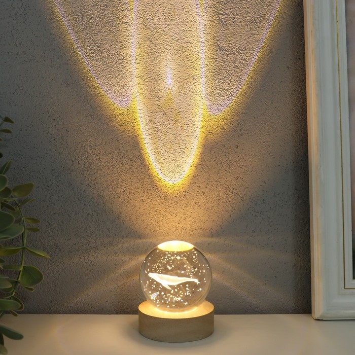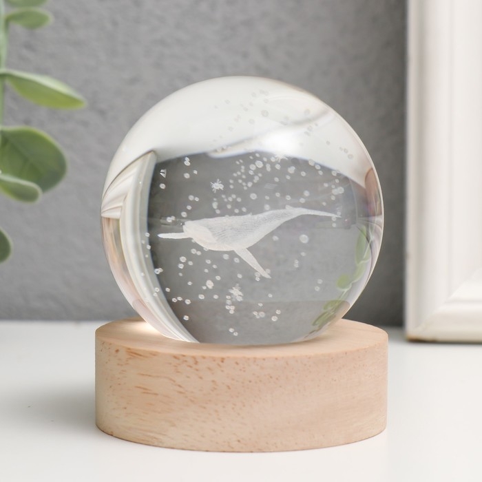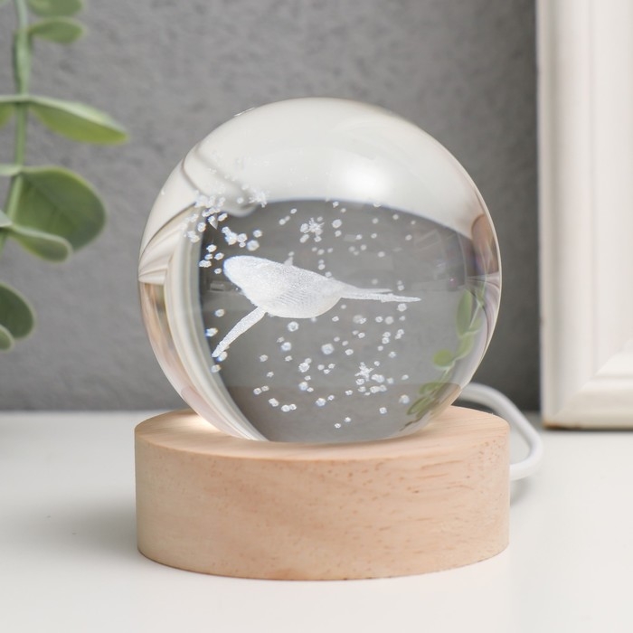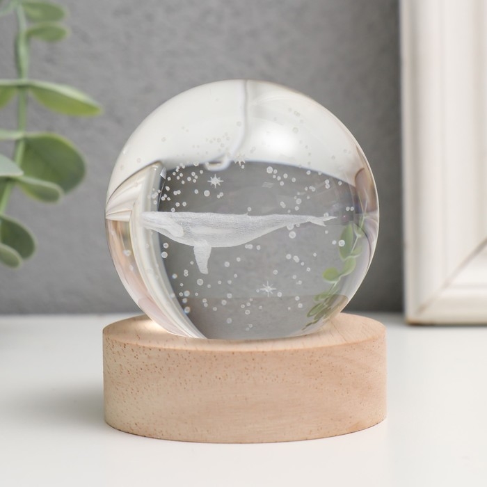 Сувенир стекло подсветка "Кит" d=6 см подставка дерево, USB 6,5х6,5х7,5 см