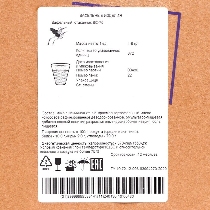 Вафельный стаканчик стандартный под мороженое. В наборе 672 хрустящих и тающих во рту стаканчиков для домашнего мороженого. Стаканчик вафельный не содержит сахара. Румяная вафля с нежным ароматом выпечки не оставит вас равнодушным. Стаканчик для мороженого можно использовать для десертов, кондитерских изделий, тортов. Стаканчики поставляются в надежной упаковке.