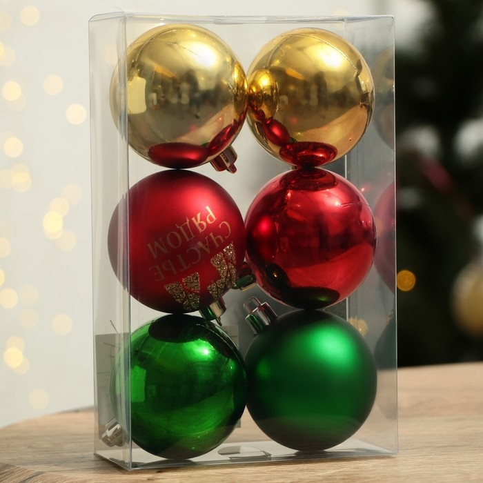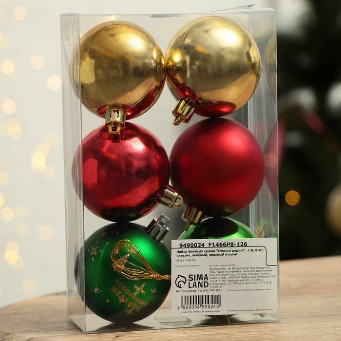 Шары ёлочные новогодние «Счастье рядом!», на Новый год, пластик, d=6, 6 шт., цвет зелёный, красный и золотой