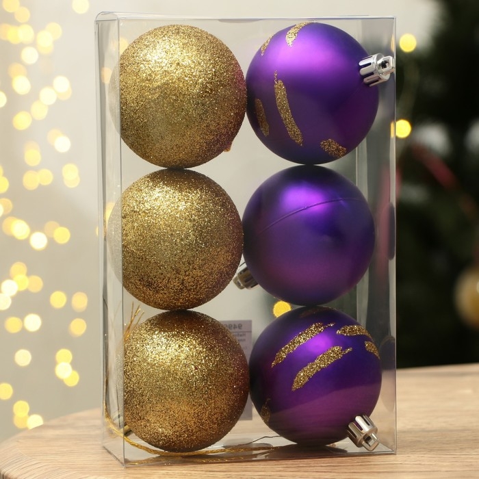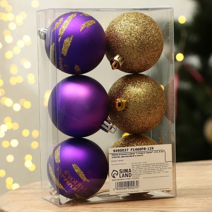 Шары ёлочные новогодние «С Новым годом!», на Новый год, пластик, d=6, 6 шт., цвет фиолетовый и золотой