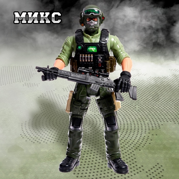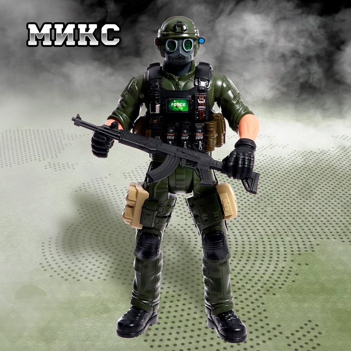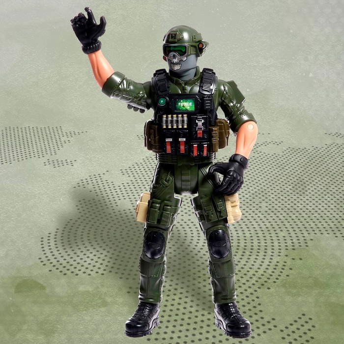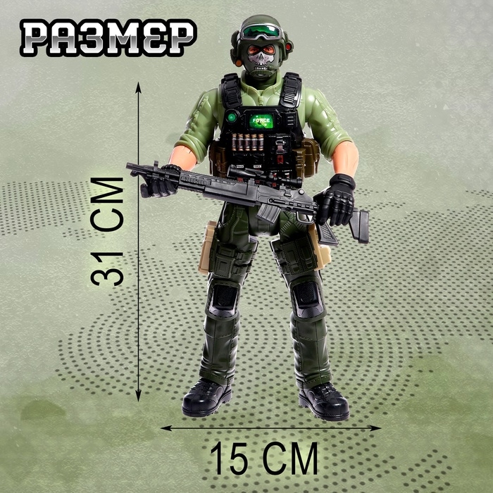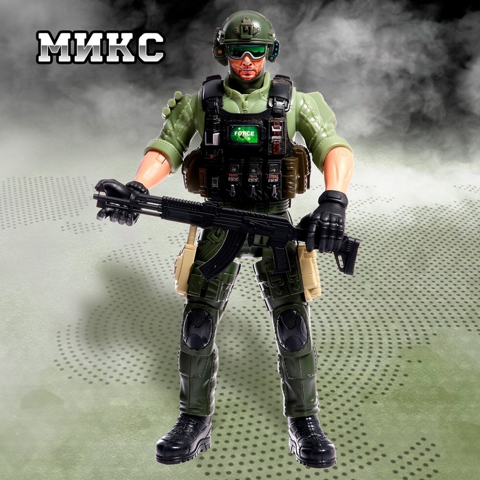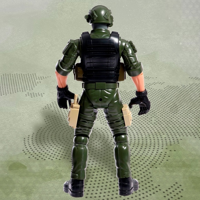 Солдат «Спецназовец» отправляется в бой. Ему и его команде предстоит бороться с врагами. Но для этого он полностью готов: на нём надеты шлем и бронежилет, в руках у него есть автомат.