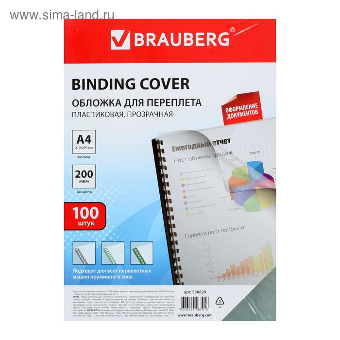 Обложки для переплета A4, 200 мкм, 100 листов, пластиковые, прозрачные бесцветные, BRAUBERG 530829