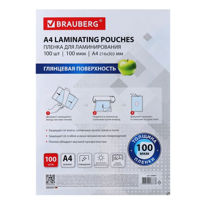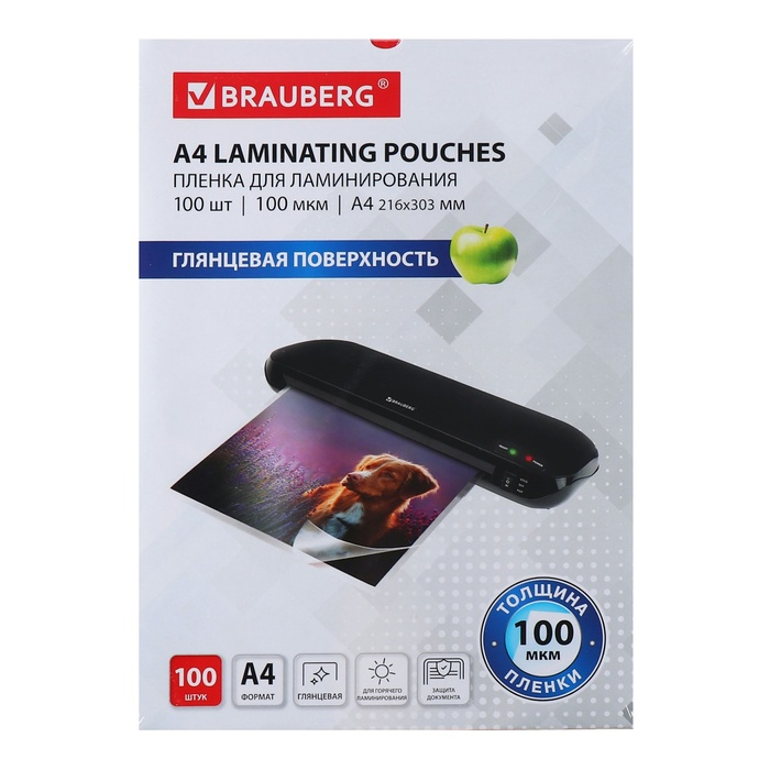 Пленка для ламинирования A4 216х303 мм, 100 мкм, 100 штук, глянцевые, BRAUBERG 530801