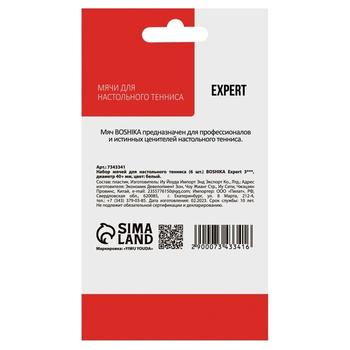Набор мячей для настольного тенниса BOSHIKA Expert 3*, d=40+ мм, 6 шт., цвет белый