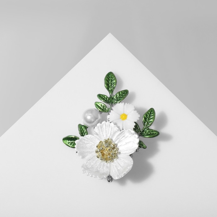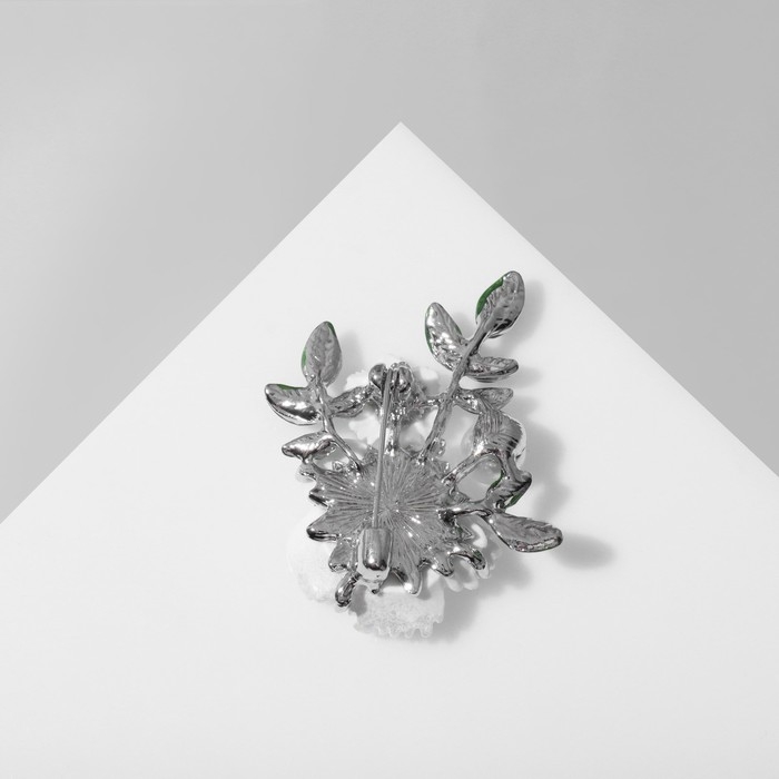 Брошь «Цветы» на ветке, цвет бело-зелёный в серебре