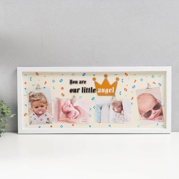 Фоторамка пластик на 4 фото 10х15 см "Корона. Маленький ангел" с прищепками белая 64х27 см