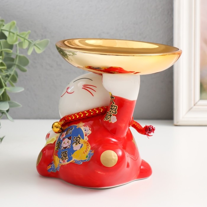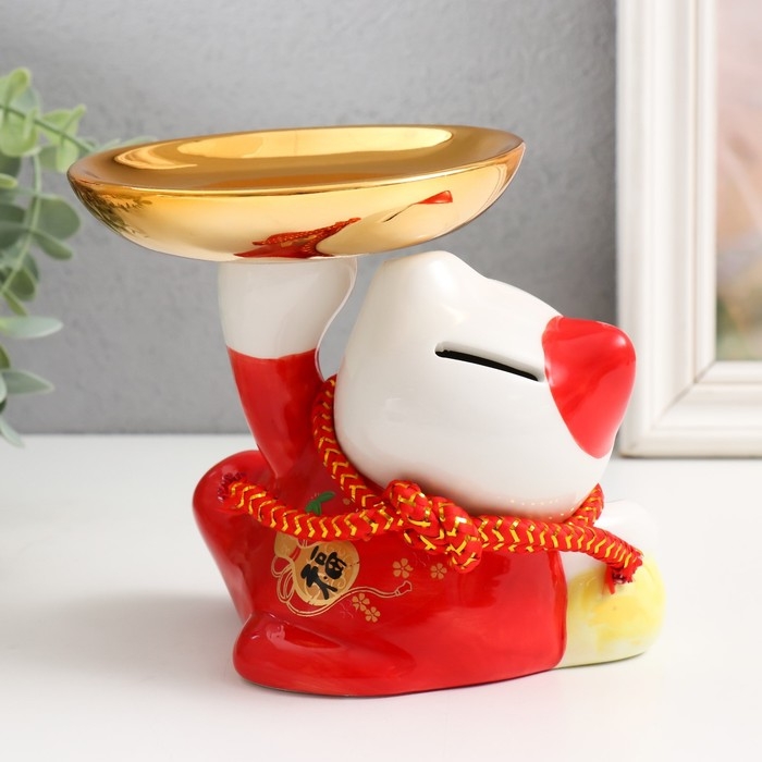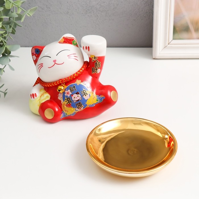 Копилка керамика "Кот Манэки-нэко для привлечения богатства с тарелкой" 11,5х15,5х13 см
