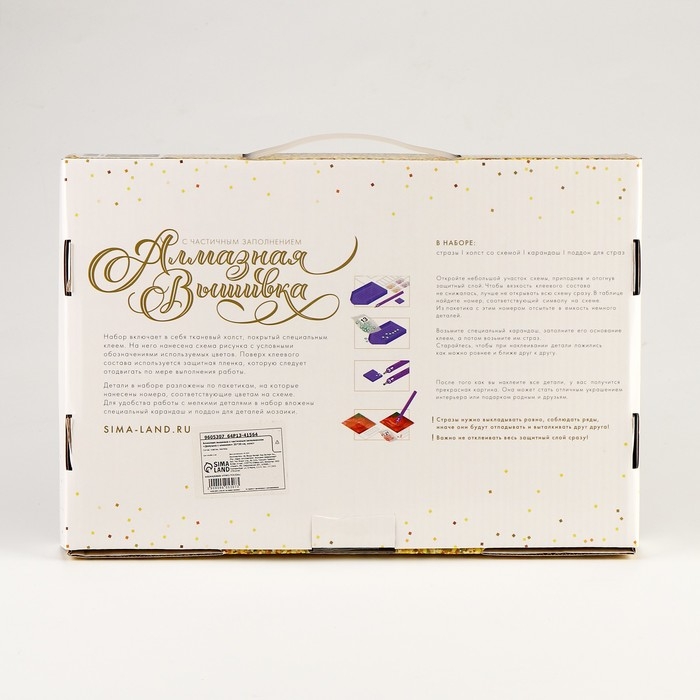 Часть изображения предстоит заполнить стразами, другая часть напечатана на холсте-основе. Поэтому набор подойдёт для тех, кто впервые пробует свои силы в этой технике или любит быстро добиваться результата.
