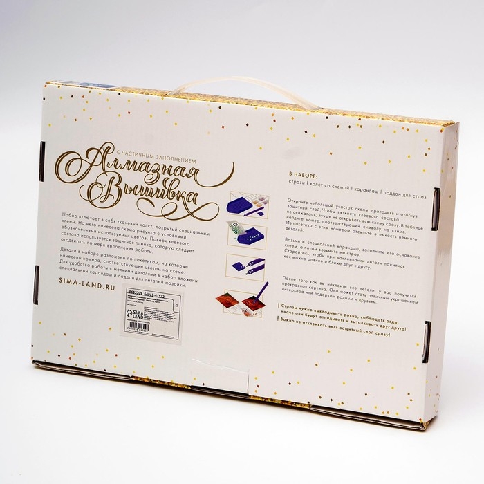 Часть изображения предстоит заполнить стразами, другая часть напечатана на холсте-основе. Поэтому набор подойдёт для тех, кто впервые пробует свои силы в этой технике или любит быстро добиваться результата.
