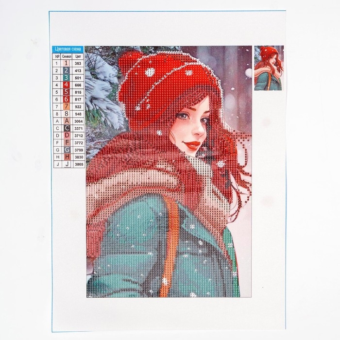 Разложите стразы с помощью карандаша по указанной схеме, заполнив полотно. Тканевая основа с точечным клеевым покрытием будет надёжно удерживать стразы. На картине уже обозначены необходимые оттенки, а цветовая таблица расположена рядом с рабочей областью холста.