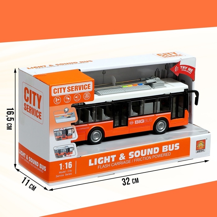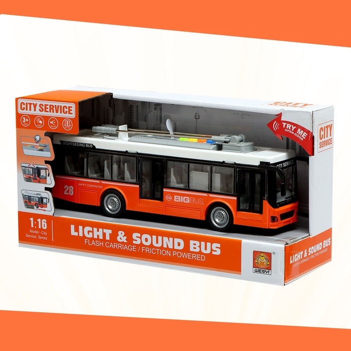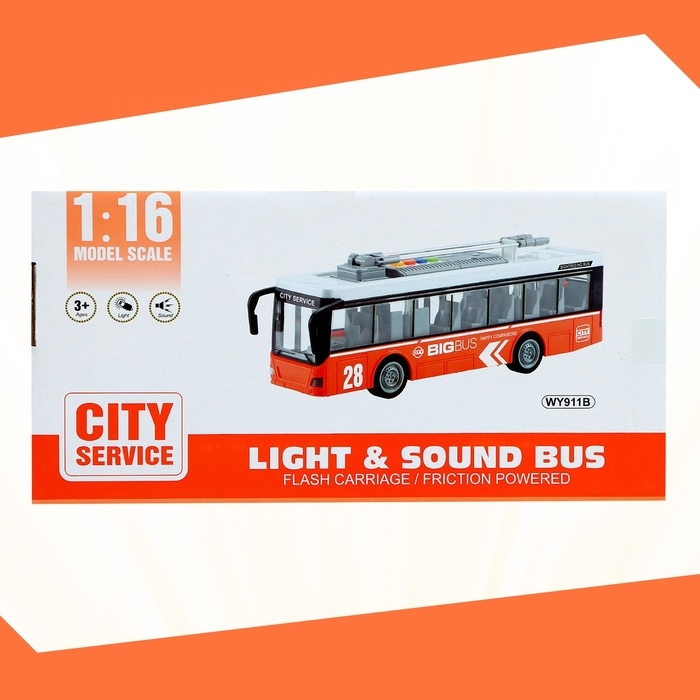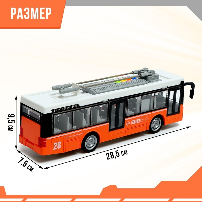 Троллейбус инерционный «Город», 1:16, свет и звук, открываются двери, цвет оранжевый