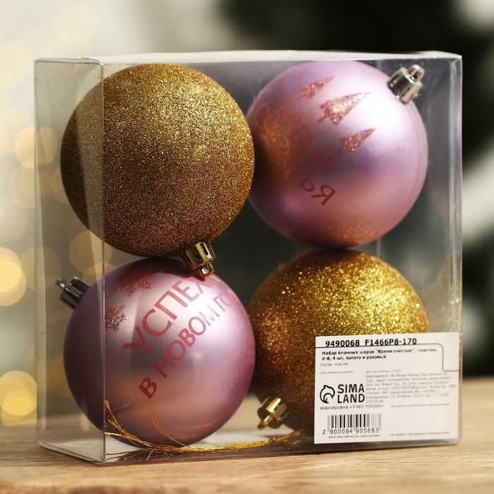 Шары ёлочные новогодние «Время счастья!», на Новый год, пластик, d=8, 4 шт., цвет золотой и розовый