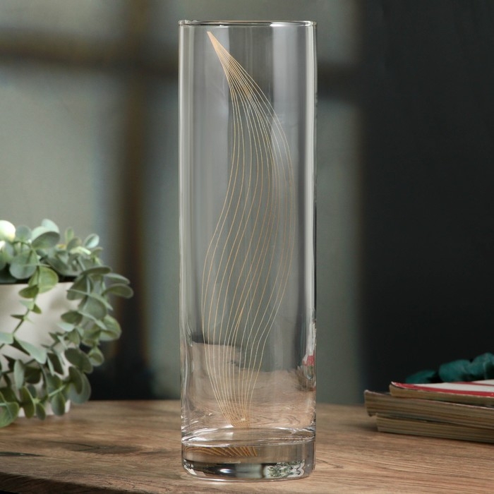 Изготовленная из стекла, она имеет цилиндрическую форму и декорирована золотистым узором.