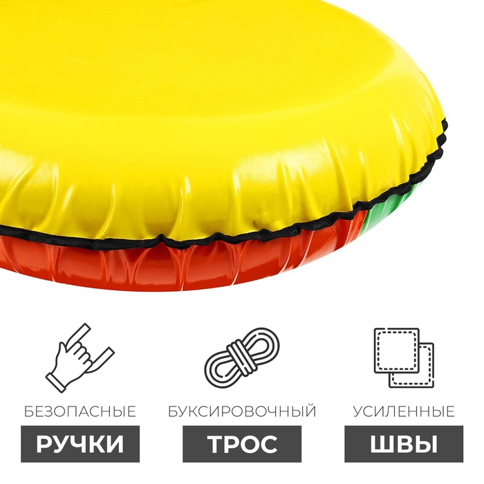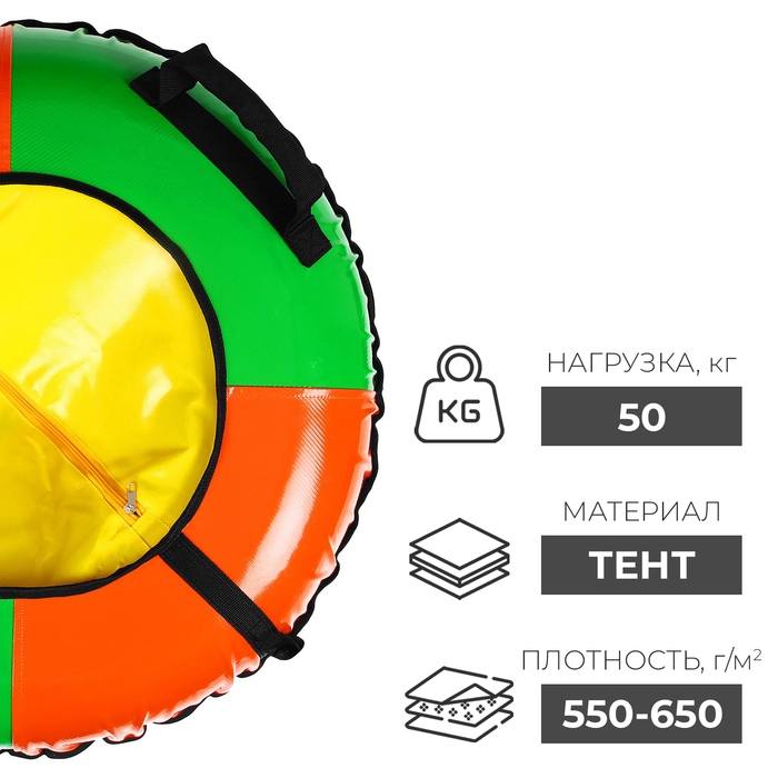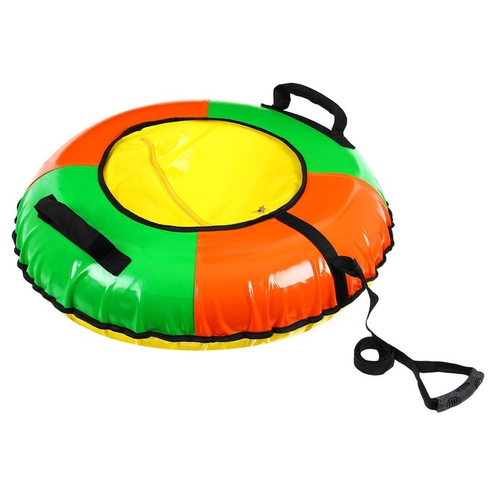 Тюбинг оснащён безопасными ручками. Его материал прослужит долго и обеспечит отличное скольжение. Фактический размер накачанного тюбинга зависит от температуры внешней среды и давления в камере.