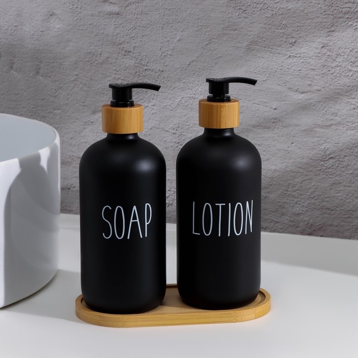 Набор дозаторов для ванной на подносе из бамбука, по 500 мл, стекло, цвет чёрный