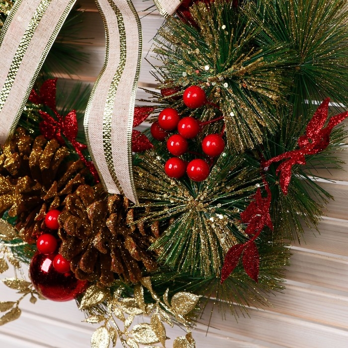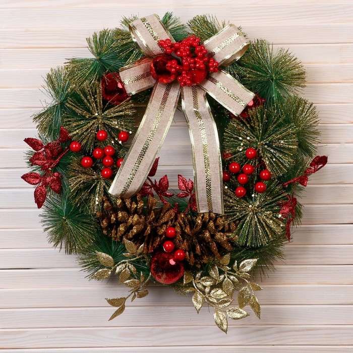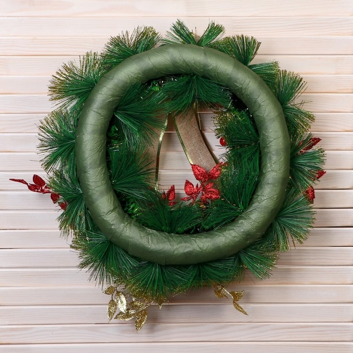Венок новогодний d- 37 см "Уютная сказка" бант в золотую полоску листья на веточках