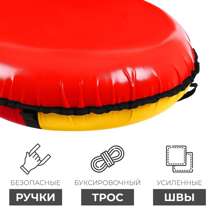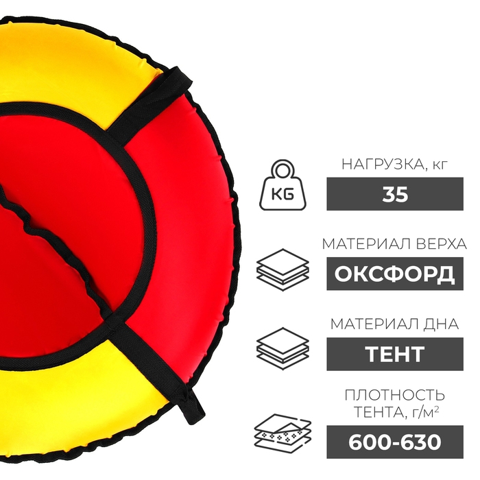 Тюбинг оснащён безопасными ручками. Его материал прослужит долго и обеспечит отличное скольжение. Фактический размер накачанного тюбинга зависит от температуры внешней среды и давления в камере.