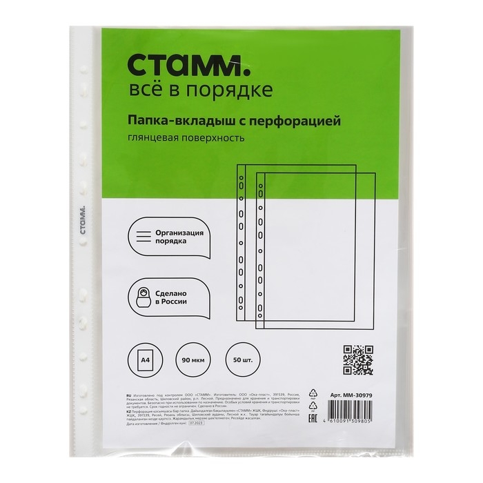 Файл-вкладыш А4, 90 мкм, Стамм, глянцевый, вертикальный, 50 штук