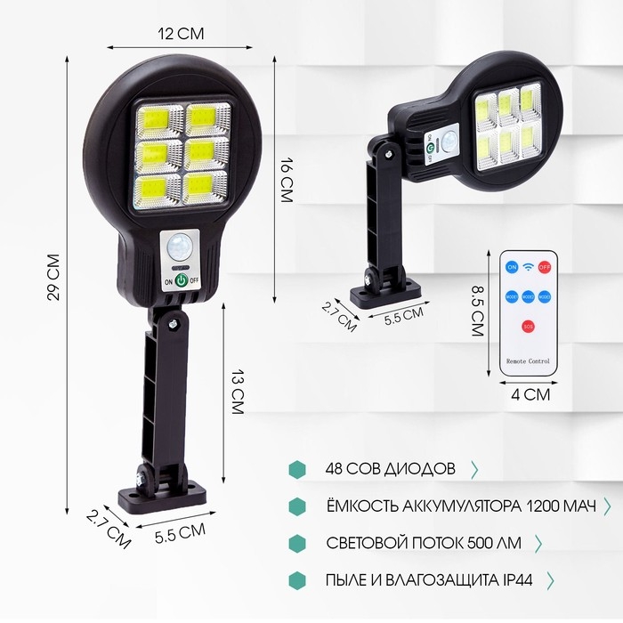 Фонарь настенный аккумуляторный с солнечной батареей — это беспроводное осветительное устройство, которое накапливает энергию днем от солнечной панели.Уличный настенный светодиодный фонарь на аккумуляторе с зарядкой от солнечной панели.Оснащен 48 яркими светодиодами COB и световой яркостью в 500 Люмен.Фонарь имеет размеры 31 x 10 x 3.5 см и комплектуется пультом дистанционного управления для выбора режима освещения.Солнечная панель фонаря имеет размеры 10.7 x 5.2 см и может использоваться для зарядки аккумулятора.В комплекте также поставляется картонная коробка для хранения и транспортировки фонаря.
